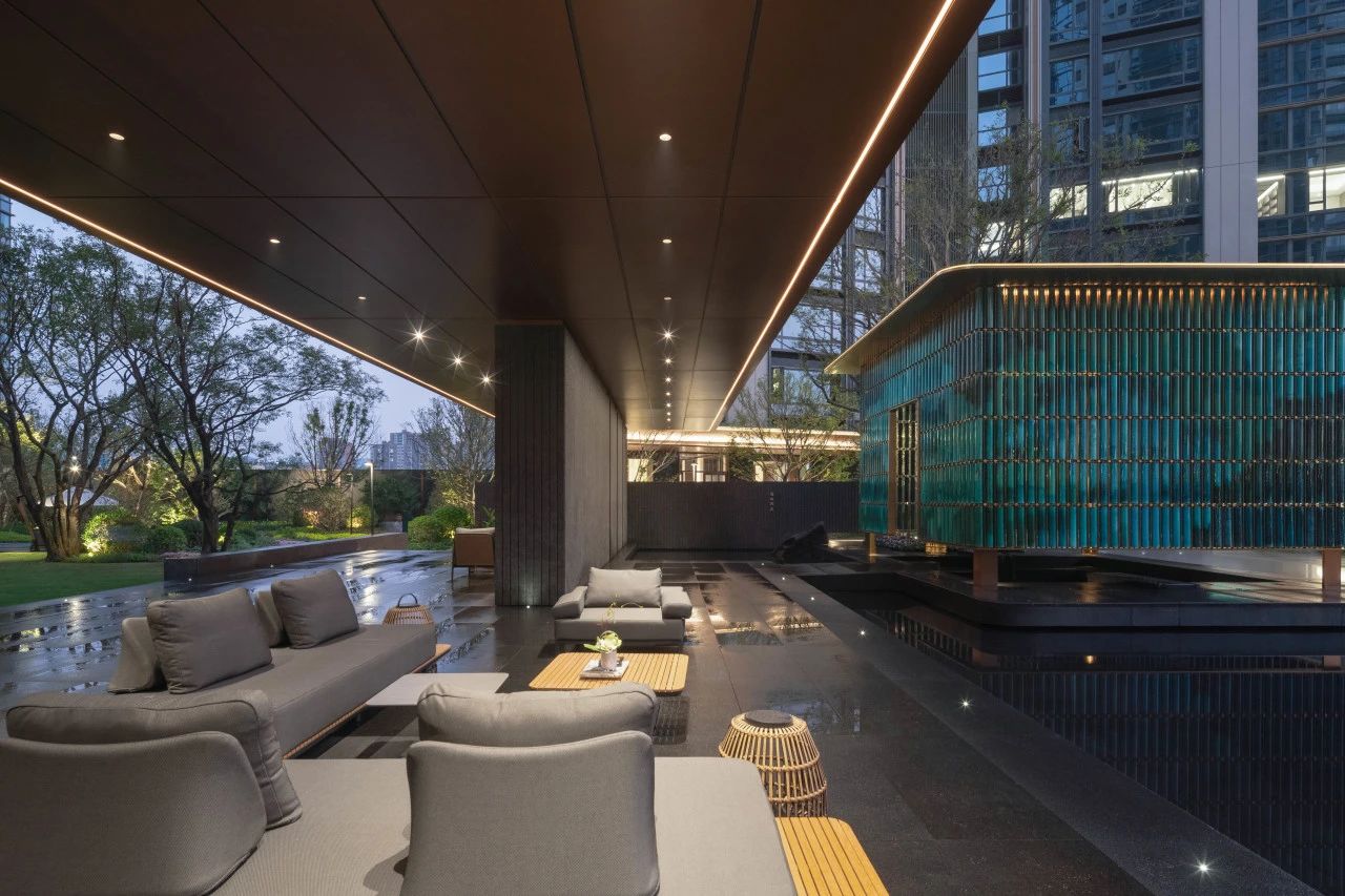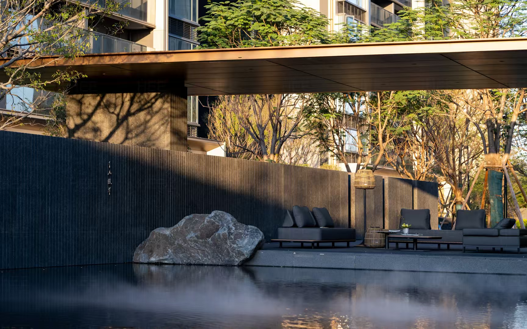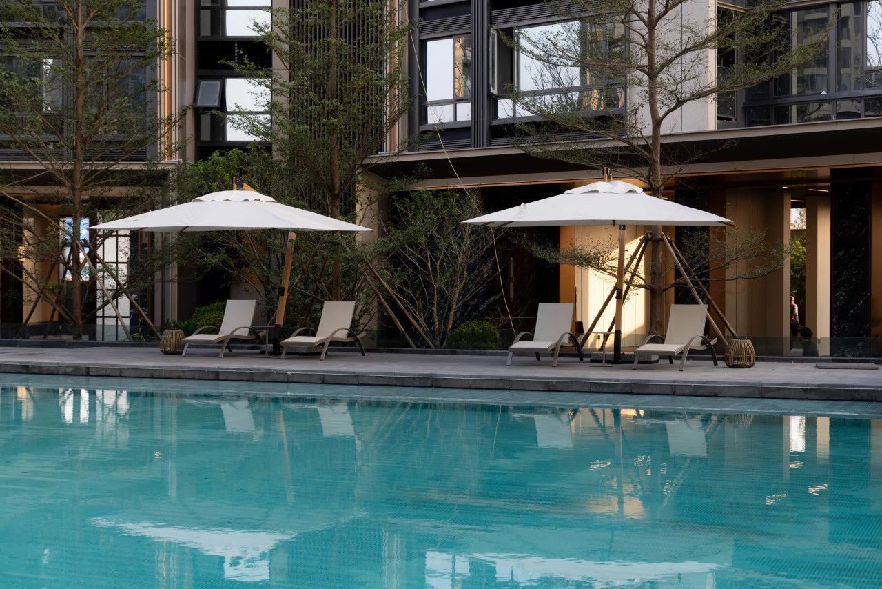 池畔一侧,嘉年华躺椅以流动的线条写意舒展。其造型轻盈而富有韵律,与水体、光影和建筑相映成趣,为放松身心提供了一处舒适又不失美感的休憩点。